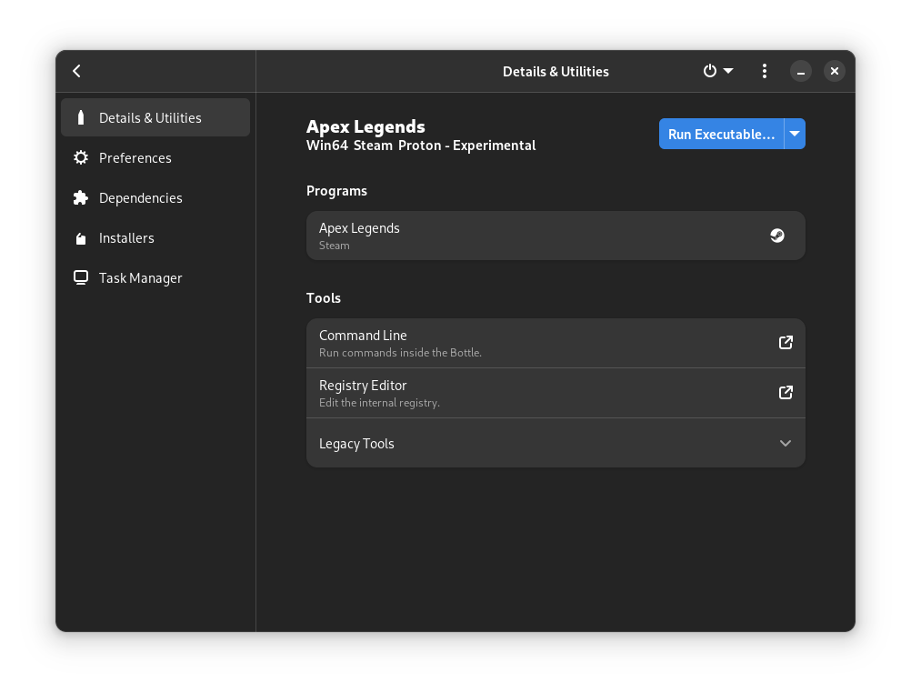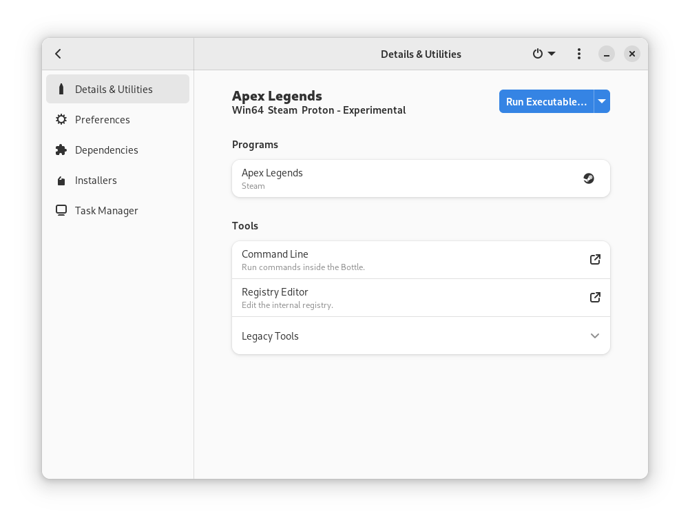 As mentioned above, this is limited prefix management since some features are entirely handled by Proton and/or Steam and altering them can cause irreparable problems. For example, it is not possible to change the runner, Bottles automatically identifies the version of Proton used by the prefix and every operation is performed using that.
